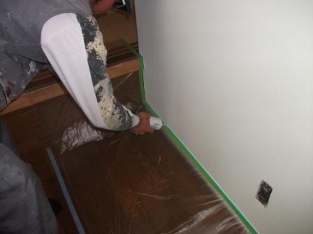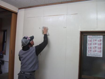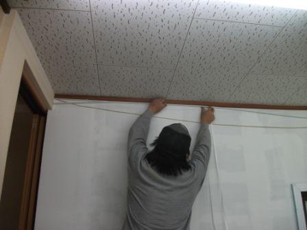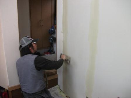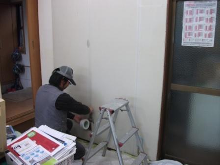 続いてボード目地部分をなくして塗装するため、パテをつけます。パテが割れてしまわないように、ファイバーテープを張ります。